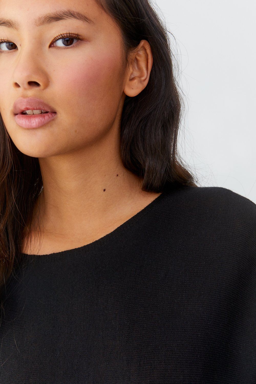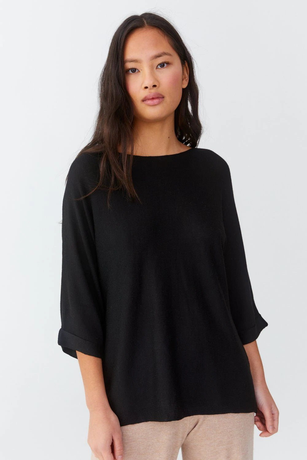 Þunn prjónuð peysa með 3/4 ermum. Beint snið úr fíngerðri bambus og kasmírblöndu. Létt og mjúk  úr náttúrulegu efni sem andar. Þessi peysa er mjög þægileg og hægt að dressa upp og niður, fyrir vinnuna, heimakósí og hentar í útiveru. Khasmere og bambus er góð blanda  fyrir viðkvæma húð, dúnmjúk og umhverfisvæn.