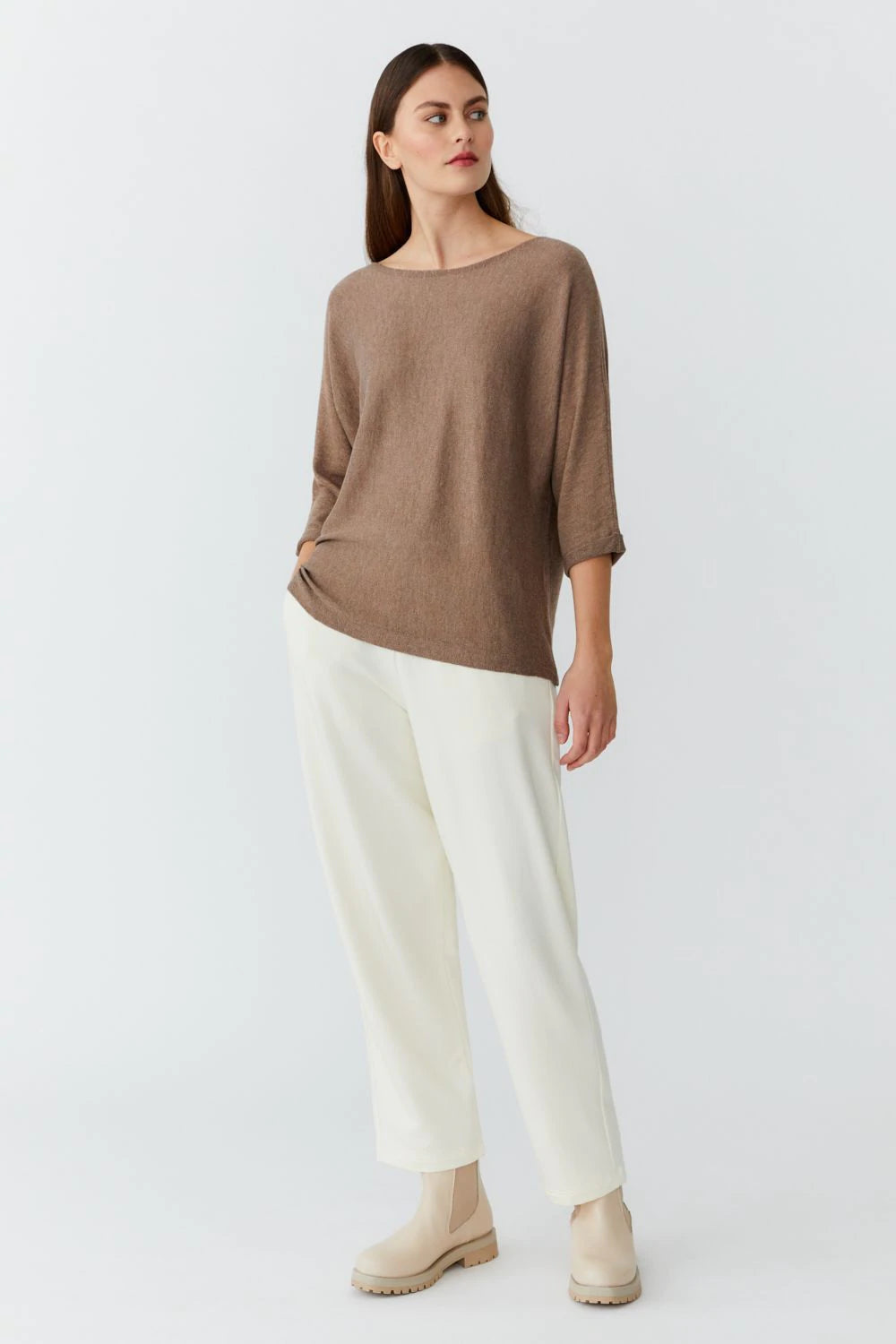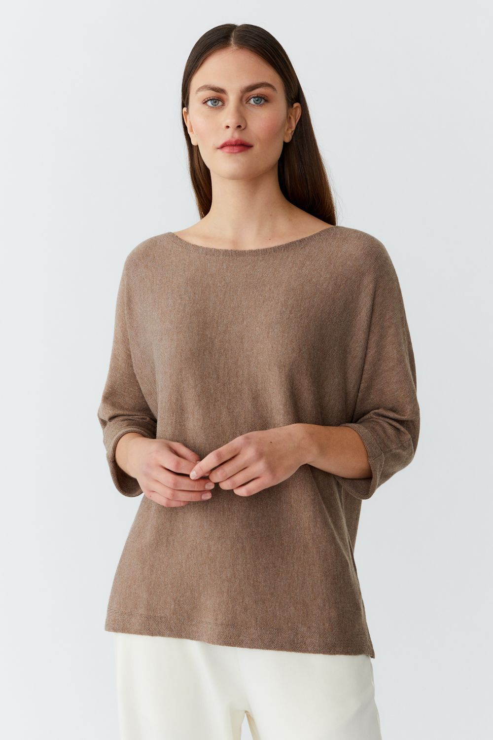 Þunn prjónuð peysa með 3/4 ermum. Beint snið úr fíngerðri bambus og kasmírblöndu. Létt og mjúk  úr náttúrulegu efni sem andar. Þessi peysa er mjög þægileg og hægt að dressa upp og niður, fyrir vinnuna, heimakósí og hentar í útiveru. Khasmere og bambus er góð blanda  fyrir viðkvæma húð, dúnmjúk og umhverfisvæn.