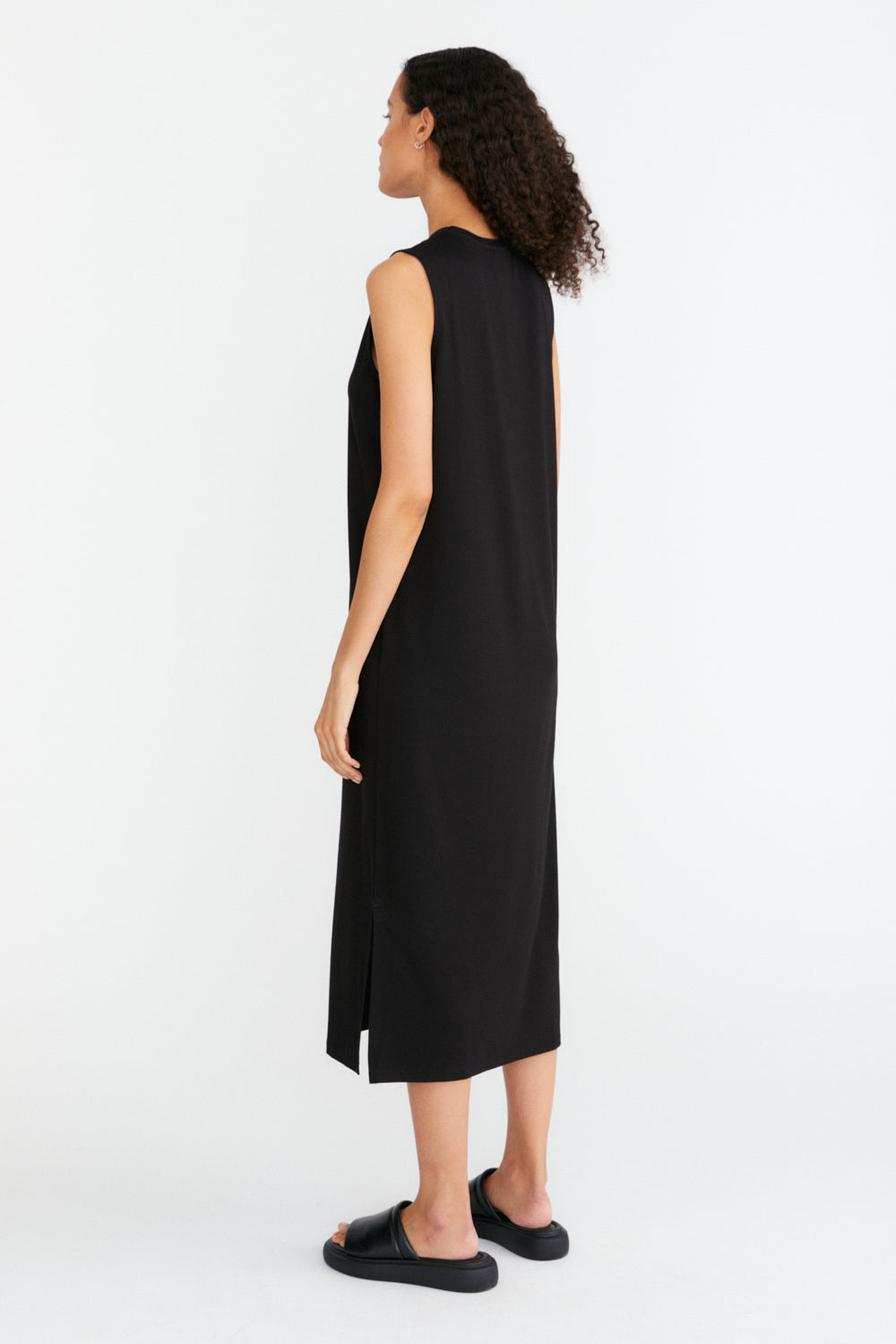 Klassískur kjóll með beinu sniði og með klaufar á hliðum. Fullkomin grunnflík sem nota má hvort heldur sem spari eða hversdags. Bambusefnið er dúnmjúkt, andar og hefur bakteríudrepandi eiginleika.