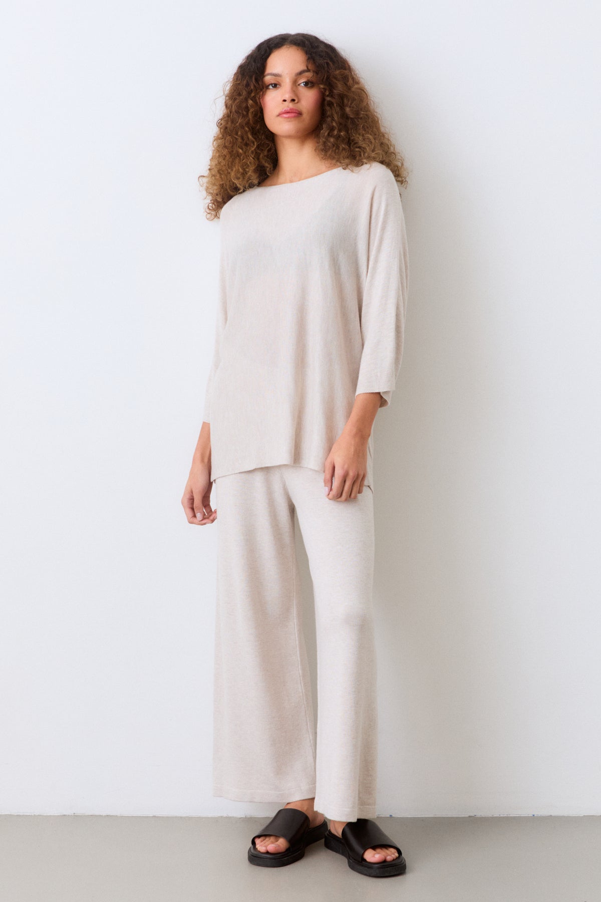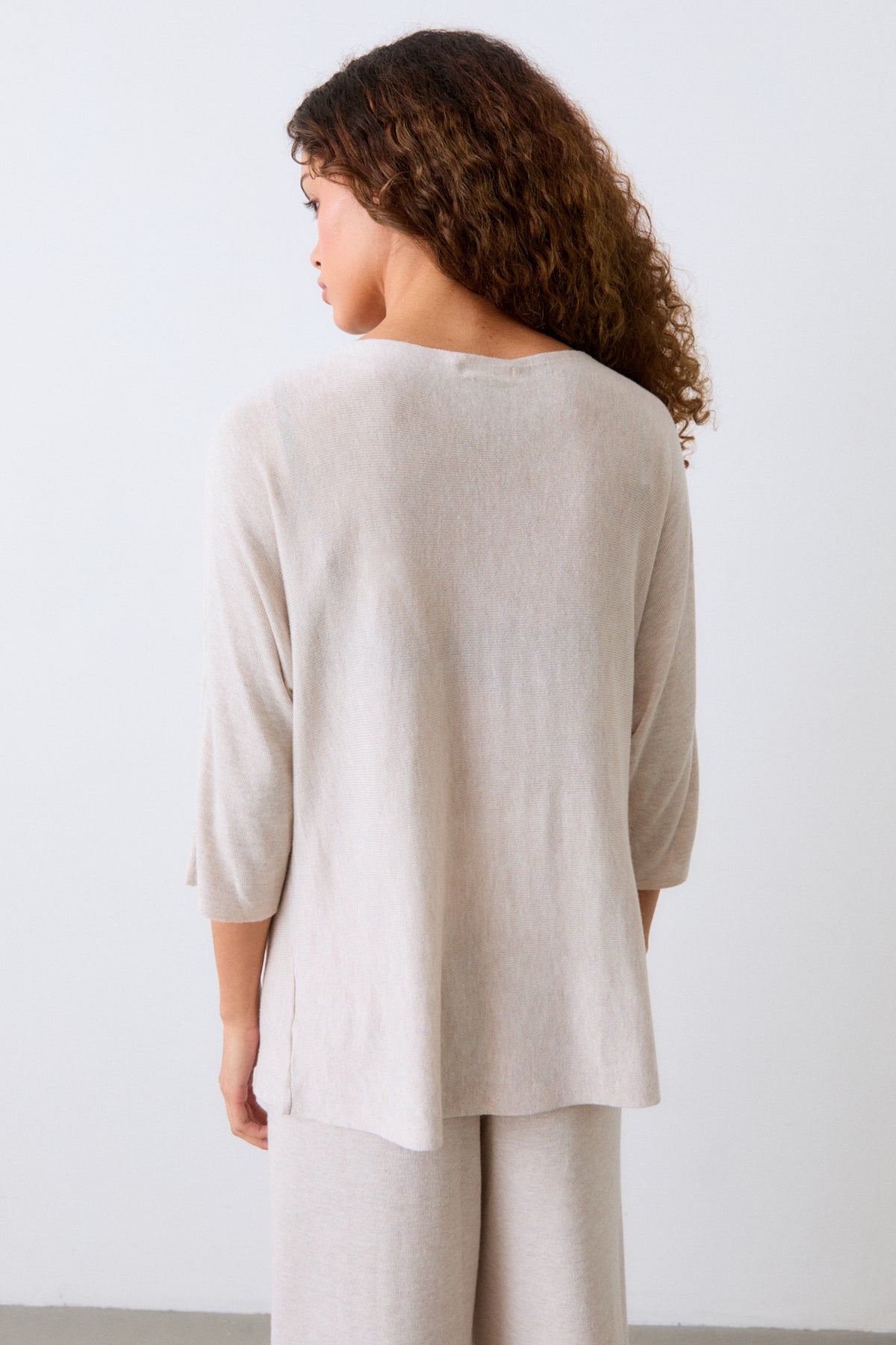 Þunn prjónuð peysa með 3/4 ermum. Beint snið úr fíngerðri bambus og kasmírblöndu. Létt og mjúk úr náttúrulegu efni sem andar. Þessi peysa er mjög þægileg og hægt að dressa upp og niður, fyrir vinnuna, heimakósí og hentar í útiveru. Khasmere og bambus er góð blanda fyrir viðkvæma húð, dúnmjúk og umhverfisvæn.