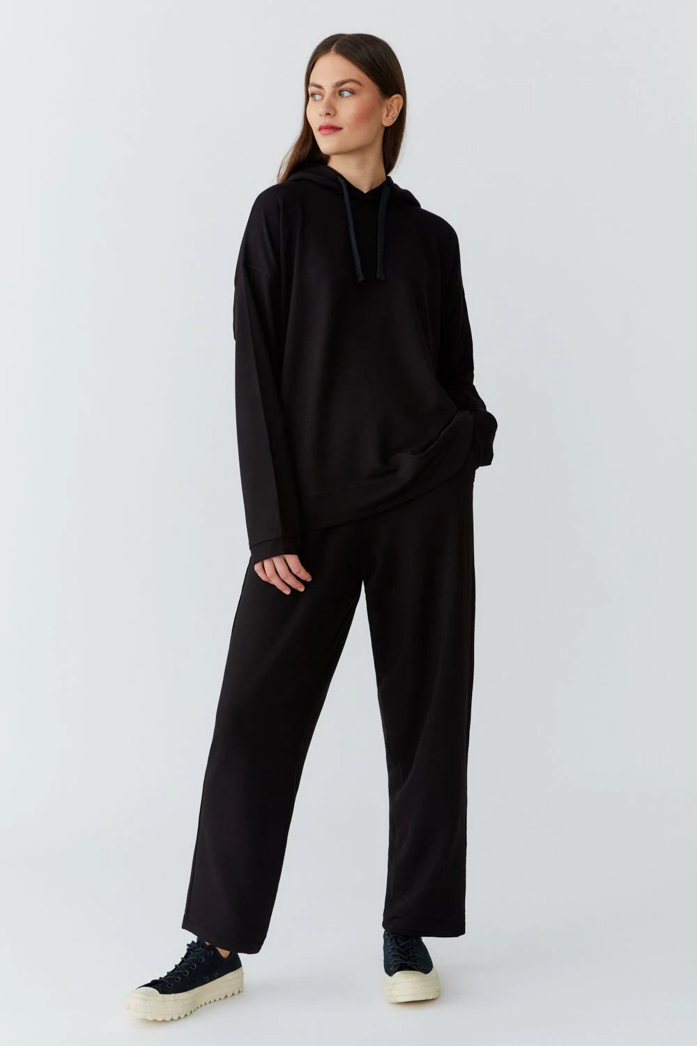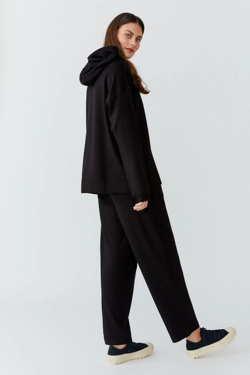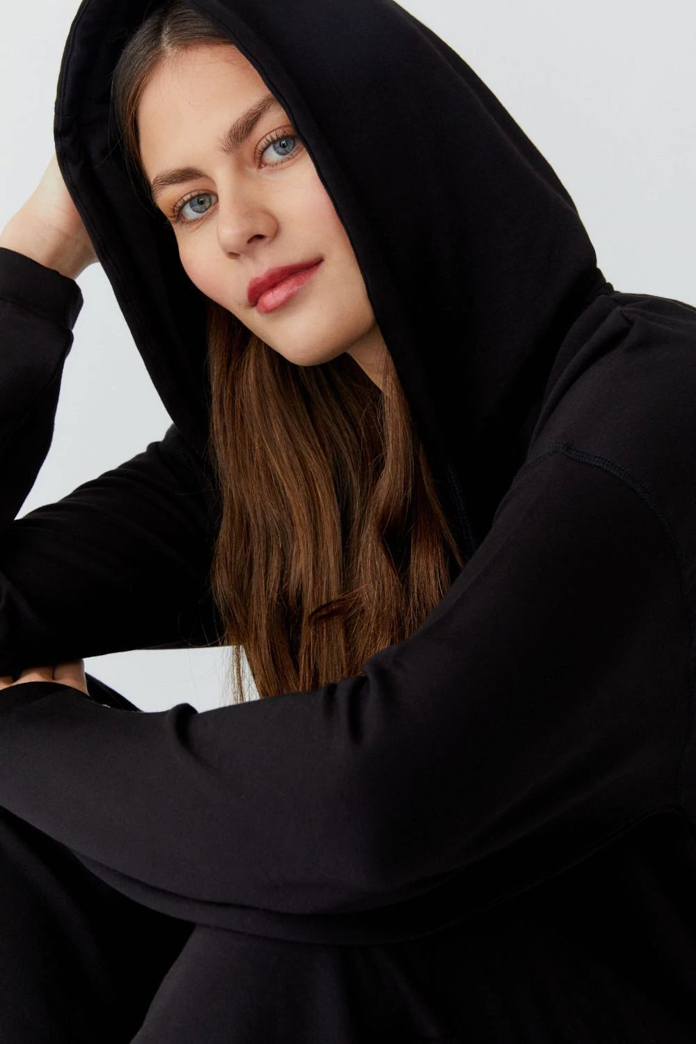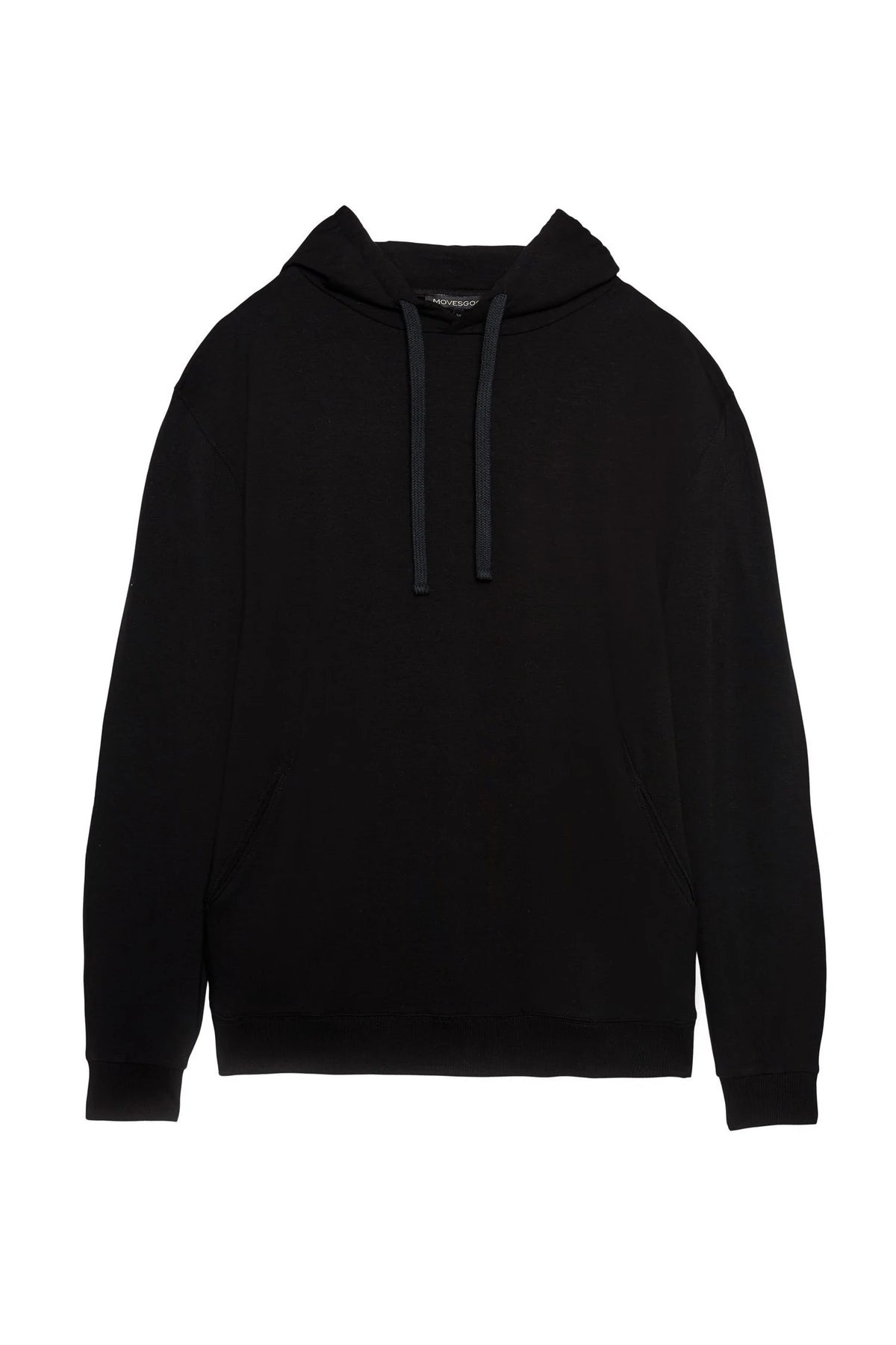 Kósý hettupeysa, loose fit og þægileg í sniðinu úr 95% Bambus lyocell og 5% elastane, með böndum í hettu. Dúnmjúk, slétt að utan, burstuð að innan og hægt að nota við öll tækifæri - slappað í sófanum, á æfingu eða í vinnunni.