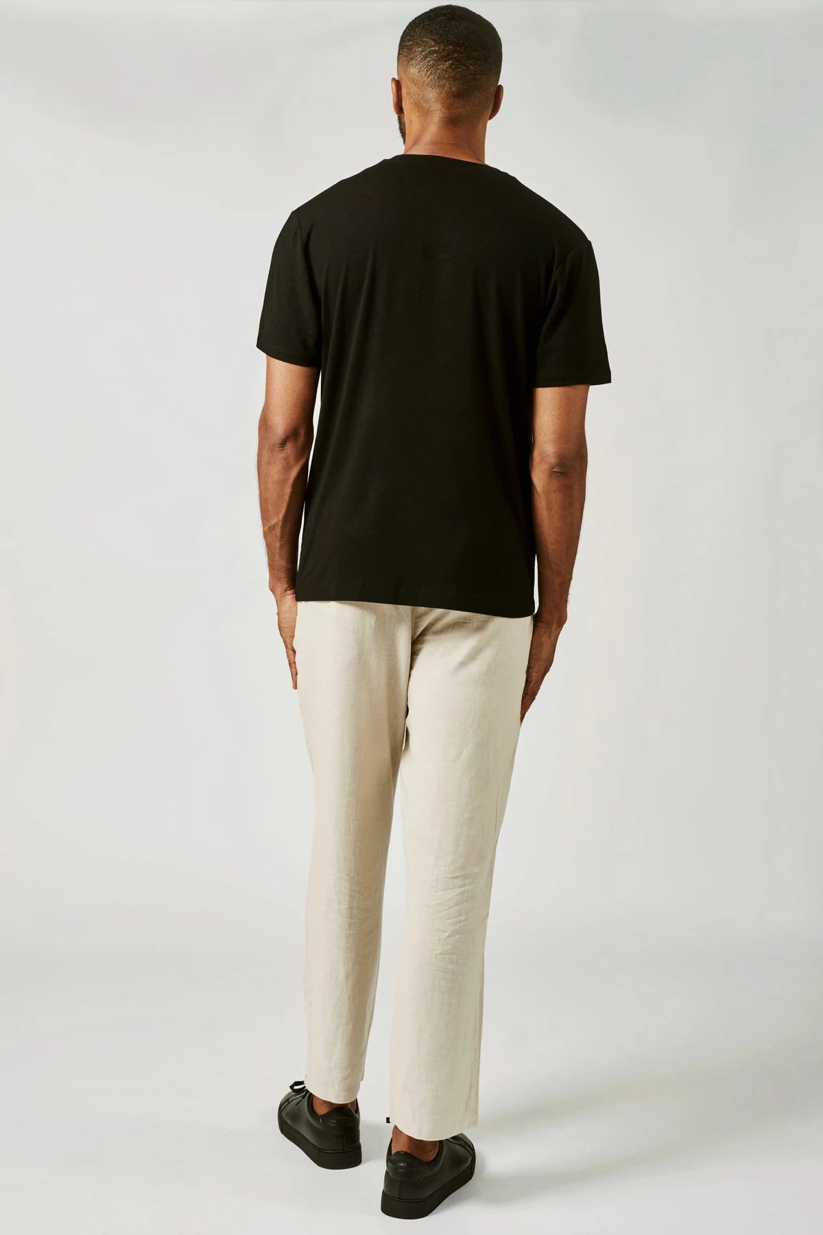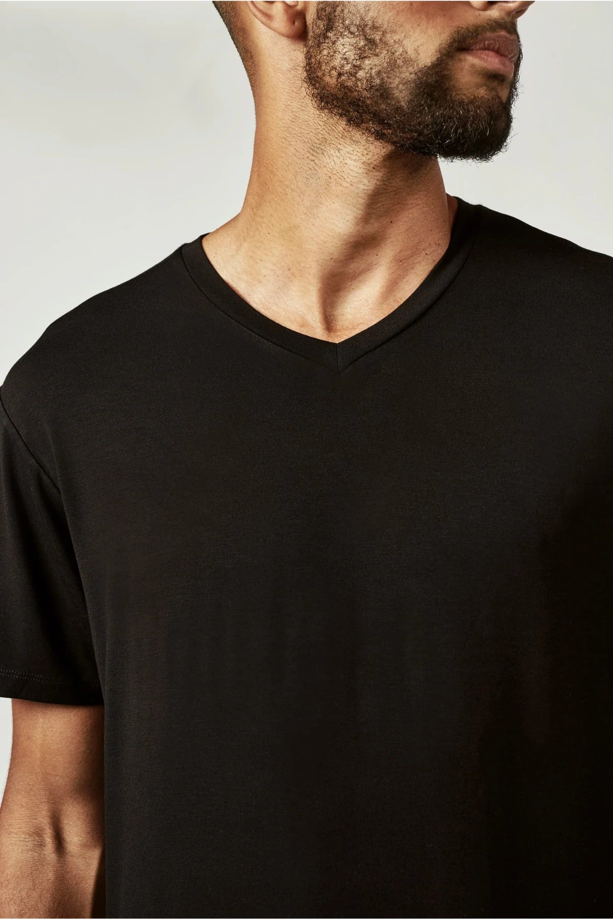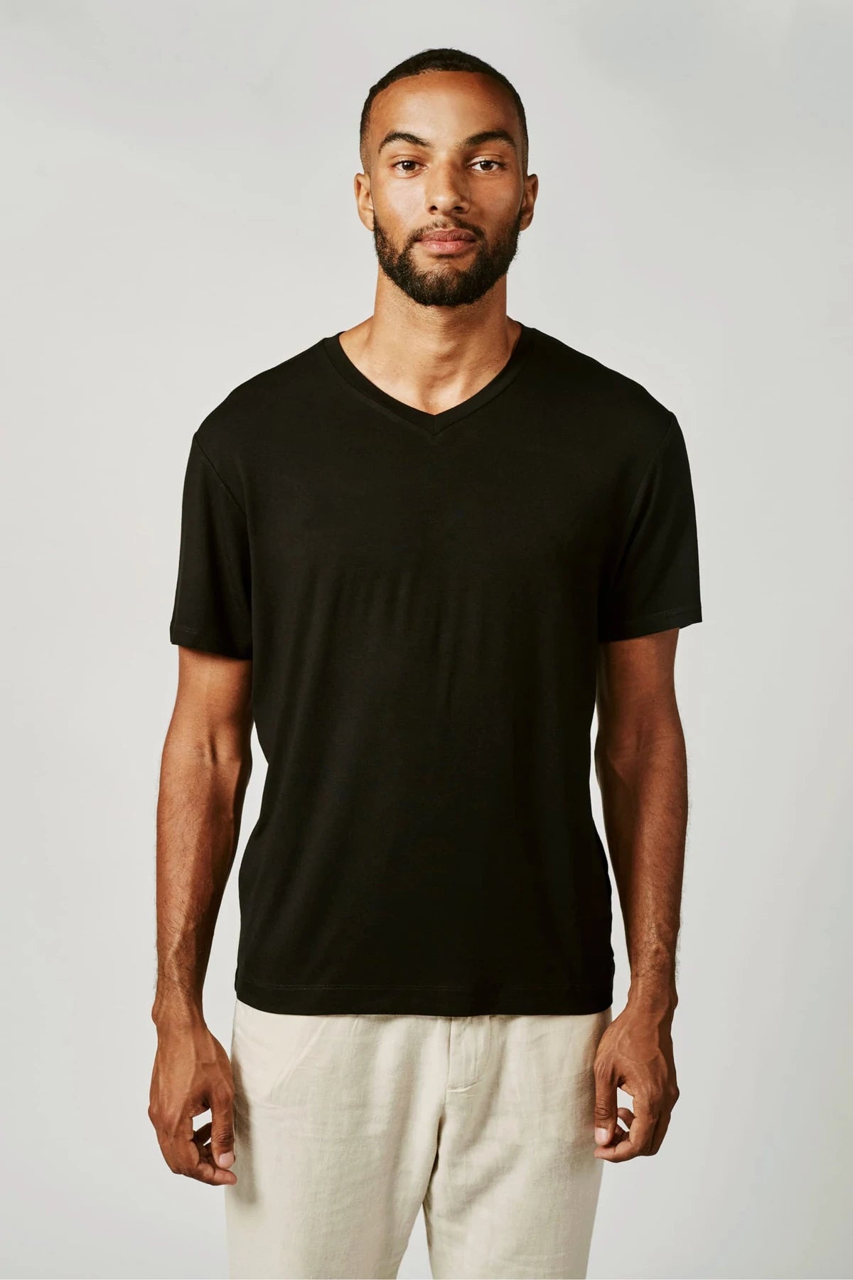 Ótrúlega þægilegur klassískur stuttermabolur. Beint snið og V-hálsmál, gerður úr mjúku bambus lyocell efni með stuttum ermum. Fullkomin grunnflík úr léttu og dúnmjúku efni. Ávinningurinn af því að nota bambus felur í sér upplifun af öndunarfatnaði sem hefur bakteríudrepandi eiginleika og er umhverfisvænt.